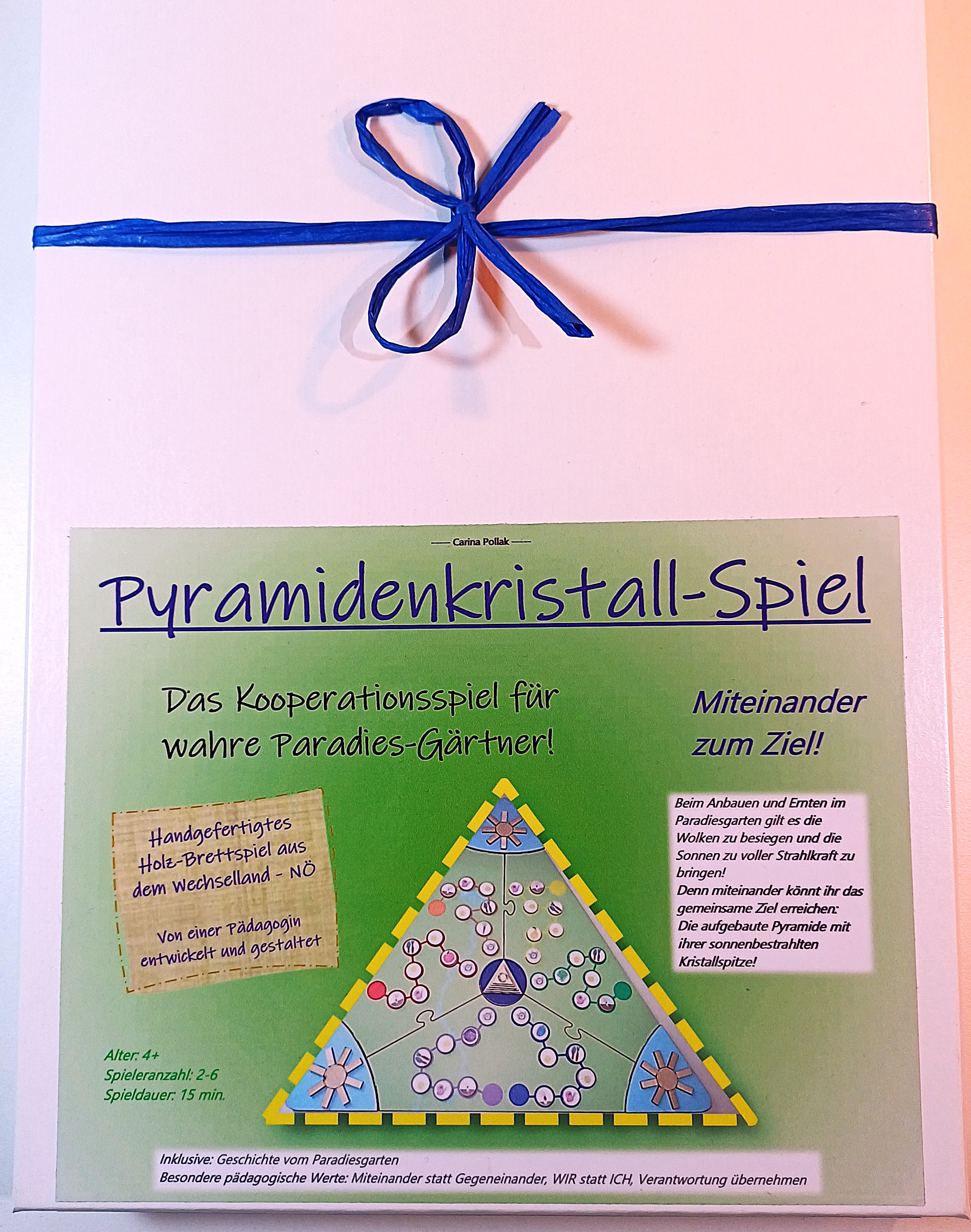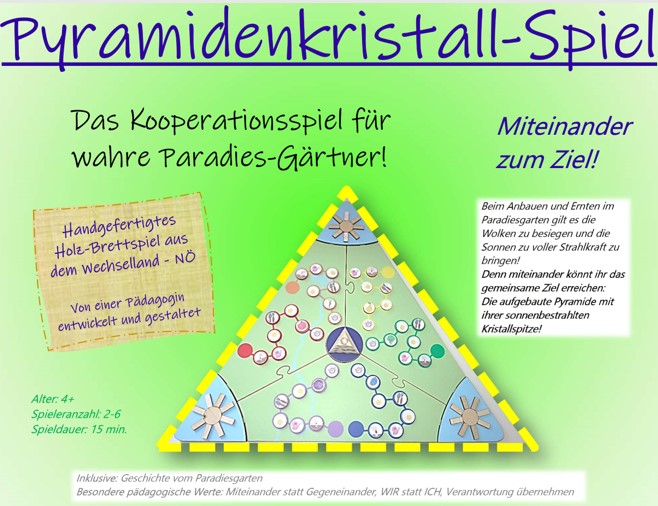 Das Pyramidenkristall-Spiel wurde von einer regionalen Spieleentwicklerin aus Österreich entworfen. Mit viel Herz, Naturverbundenheit und pädagogischem Bewusstsein entstand ein Spiel, das Kinder in ihrem sozialen Miteinander stärkt.