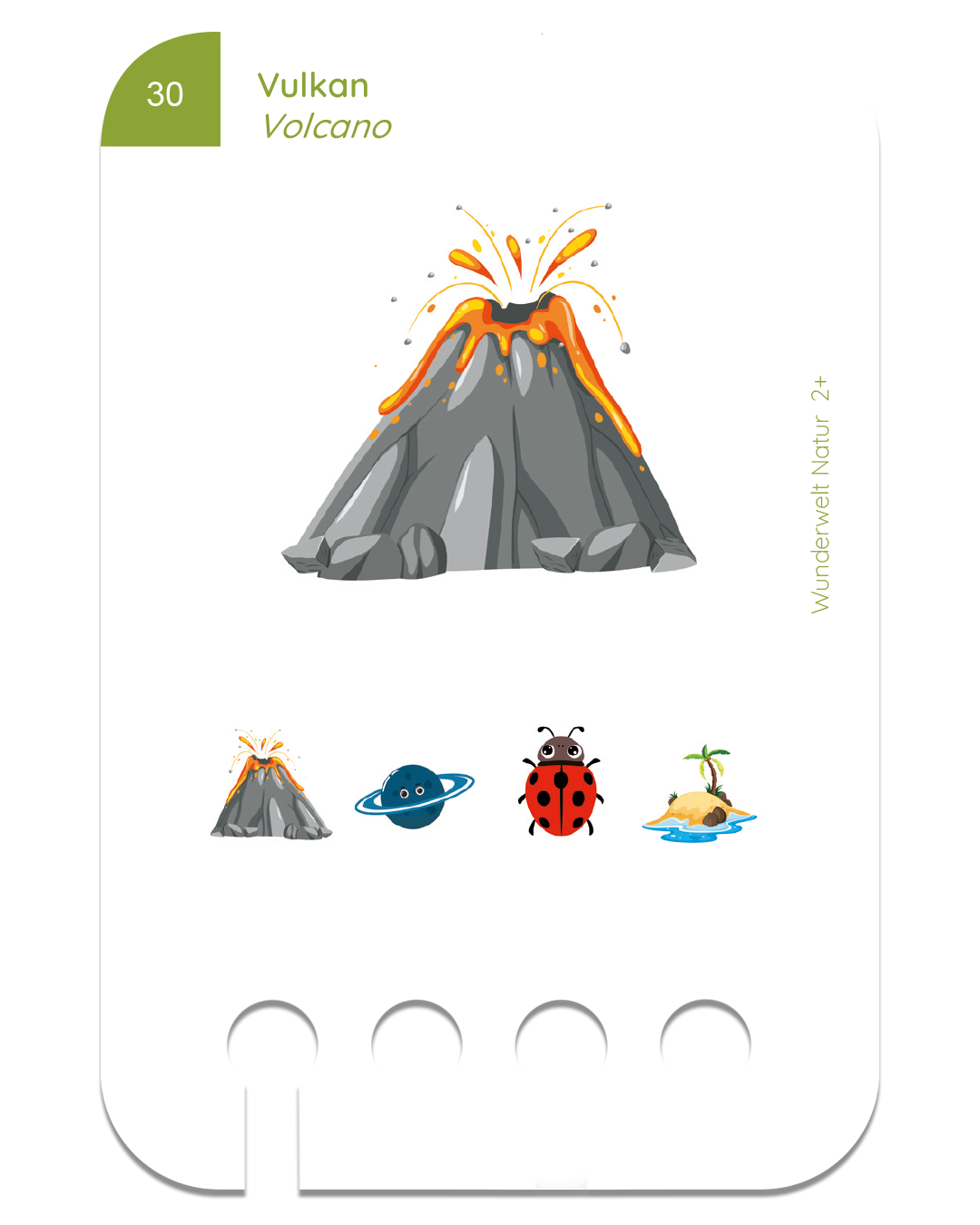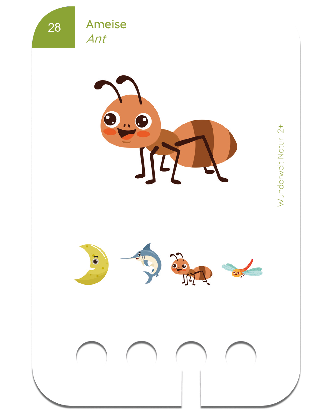 Alle Karten sind doppelseitig in Deutsch und Englisch bedruckt. So werden früh erste englische Begriffe eingeführt und die sprachliche Entwicklung spielerisch unterstützt.