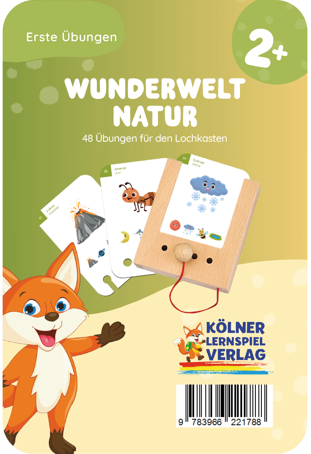 „Wunderwelt Natur“ ist ein liebevoll gestaltetes Lernspiel für Kinder ab 2 Jahren. Die 24 altersgerecht entwickelten Aufgabenkarten wurden speziell für den Kölner Lochkasten vom Kölner Lernspielverlag konzipiert und fördern spielerisch erste Naturerfahrungen, Wahrnehmung und Sprachentwicklung.
